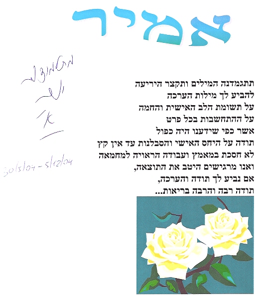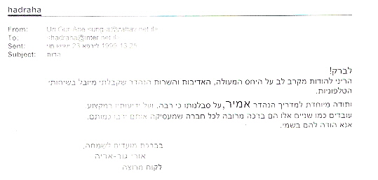 מכתב התודה הראשון שקיבלתי בתאריך 23/04/1999