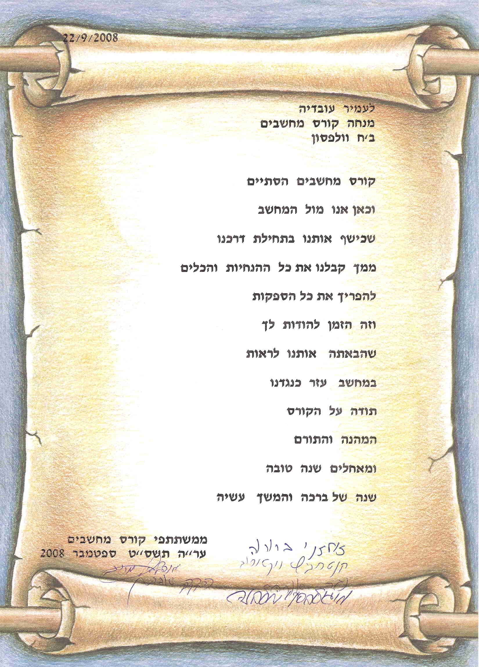 מכתב תודה בסיום קורס יישומי המחשב בבי"ח וולפסון 22/09/2008